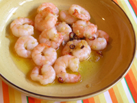 2. フライパンにオリーブオイル・にんにく・鷹のつめを入れて加熱し、海老を加えて炒め火が通ったら塩で調味する。