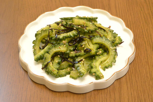 1. ゴーヤは縦半分に切って種とワタを取り除き、1mm幅の薄切りにして塩もみをする。