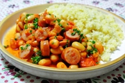ソーセージ 玉ねぎ にんにく サラダ油 水煮大豆 チリパウダー ローリエ ホールトマト缶 コンソメの素 ケチャップ 塩 こしょう クスクス オリーブ油 パセリのみじん切り 水