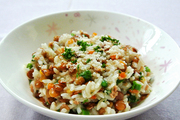 レンズ豆 玉ねぎ にんにく にんじん さやいんげん(三度豆) オリーブ油 白ワイン 水 ご飯 粉チーズ 塩 鶏挽き肉 顆粒コンソメの素 こしょう バター パセリのみじん切り