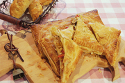 赤パプリカ 黄パプリカ ズッキーニ 玉ねぎ フェタチーズ(瓶詰) カッテージチーズ 塩 粗挽き黒こしょう オールスパイス オレガノ(乾燥) オリーブ油 冷凍パイ生地(20cm×20cm) 牛乳